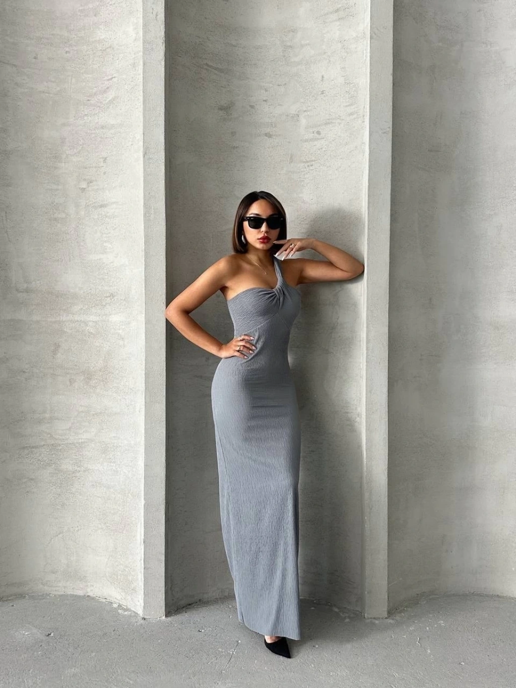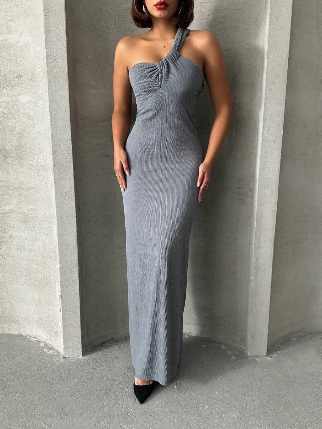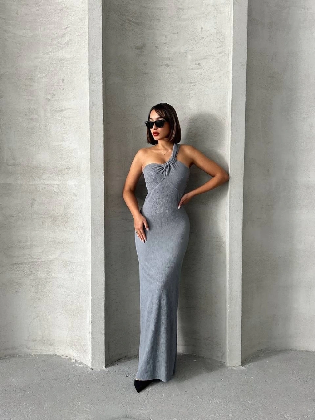 Tek omuz pliseli elbise